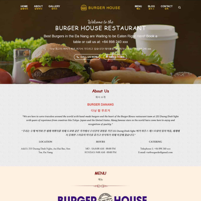 • Banner Burger House Restaurant nổi bật: Trình bày hình ảnh burger cận cảnh kèm nút call us now và directions đúng bố cục demo.