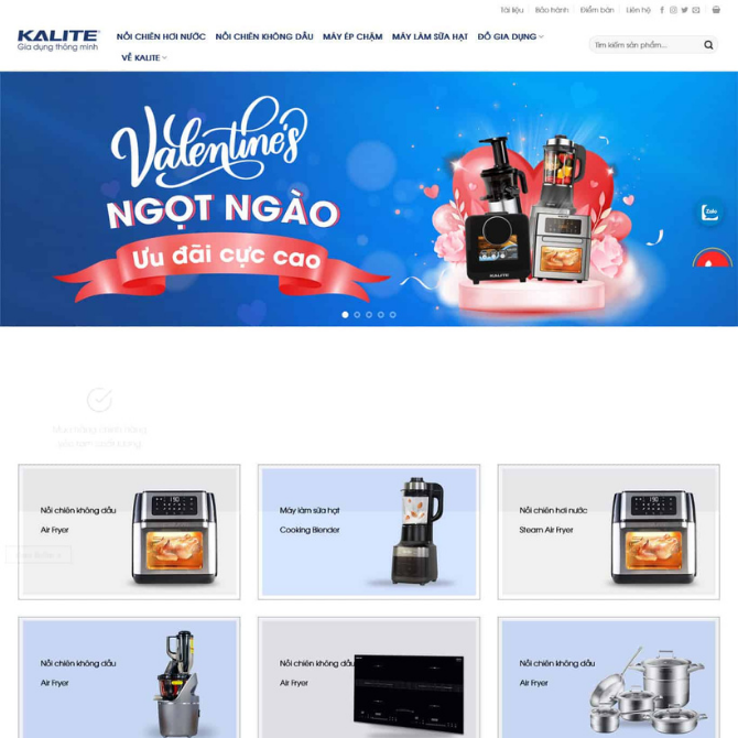 Website Bán Gia Dụng 02 thuộc danh mục Website Bán Hàng – Website Gia Dụng. Được thiết kế chuyên biệt cho thương hiệu và cửa hàng kinh doanh đồ gia dụng với giao diện hiện đại, nổi bật banner “Valentine’s Ngọt Ngào – Ưu đãi cực cao” và hình ảnh sản phẩm Kalite. Bố cục nội dung rõ ràng theo từng khu vực chức năng, tập trung giới thiệu nồi chiên hơi nước, nồi chiên không dầu, máy ép chậm, đồ gia dụng, video đồng hành cùng Kalite, đối tác, tin tức và thông tin hỗ trợ khách hàng. Cách trình bày giúp khách hàng dễ xem sản phẩm, so sánh giá, đặt mua nhanh chóng và tăng chuyển đổi bán hàng.