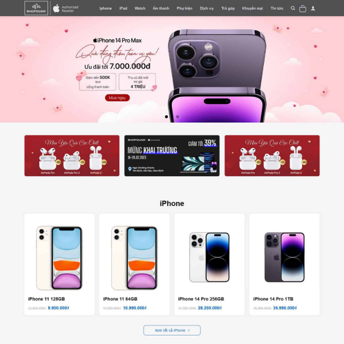 • Khu sản phẩm theo nhóm: Sắp xếp sản phẩm iPhone, iPad, Mac, Watch theo từng section.
