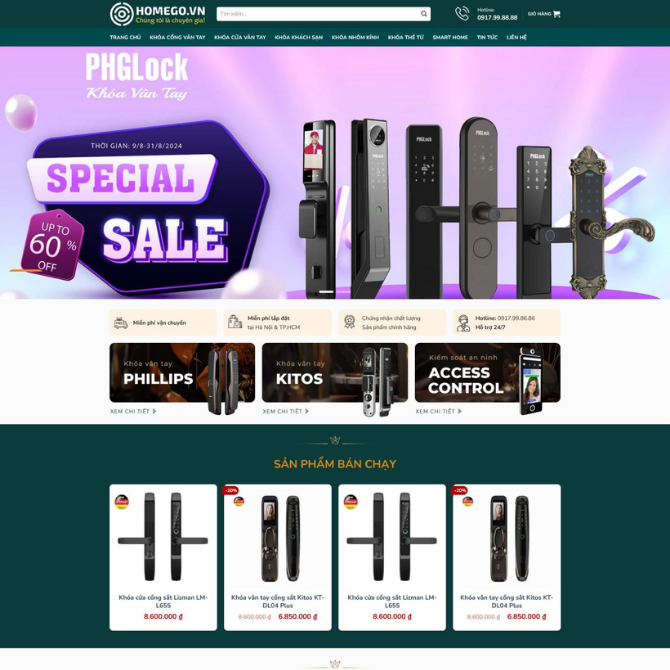 • Giao Diện Hiện Đại & Chuyên Nghiệp: Banner lớn với hình ảnh khóa cửa vân tay cao cấp, sắc nét và nổi bật với chương trình giảm giá. Tone màu tím – xanh đậm mang đến cảm giác sang trọng, phù hợp với ngành hàng thiết bị an ninh – khóa cửa thông minh.
