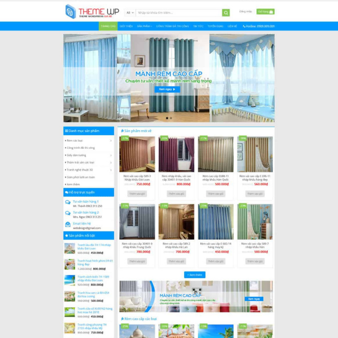 Website Bán Mành Rèm thuộc danh mục Website Bán Hàng – Website Nội Thất. Giao diện được thiết kế theo phong cách website bán mành rèm hiện đại, bố cục tập trung hiển thị banner lớn, danh mục sản phẩm theo từng loại rèm và các khối nội dung hỗ trợ bán hàng. Tông màu xanh – trắng chủ đạo tạo cảm giác chuyên nghiệp, phù hợp cho cá nhân và doanh nghiệp kinh doanh mành rèm xây dựng kênh bán hàng trực tuyến.
