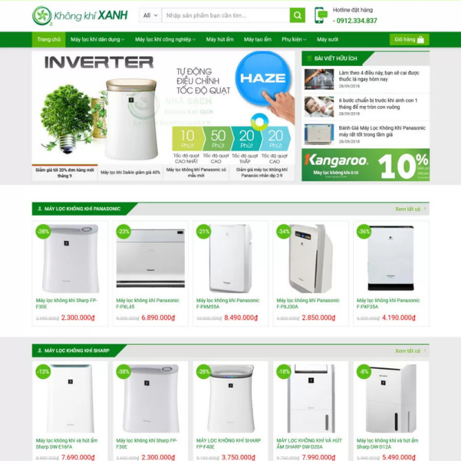 Website Bán Máy Lọc Khí 02 thuộc danh mục Website Bán Hàng – Website Gia Dụng. Được thiết kế chuyên biệt cho cửa hàng kinh doanh máy lọc không khí với giao diện xanh lá hiện đại, nổi bật banner công nghệ Inverter, Haze và các chương trình giảm giá. Bố cục nội dung rõ ràng theo từng khu vực chức năng, tập trung giới thiệu máy lọc không khí Panasonic, Sharp, Coway, máy lọc và tiệt trùng PureSys, bài viết – tin tức, video, thương hiệu đối tác và thông tin liên hệ. Cách trình bày giúp khách hàng dễ xem sản phẩm, so sánh giá, đặt mua nhanh chóng và tăng chuyển đổi bán hàng.