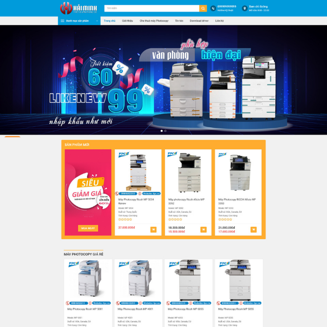 • Sản Phẩm Mới Nổi Bật: Hiển thị các model photocopy mới – like new – nhập khẩu, kèm nhãn “Siêu giảm giá”. Mỗi sản phẩm có hình ảnh rõ nét, thông số cơ bản và giá bán công khai giúp khách hàng dễ so sánh.