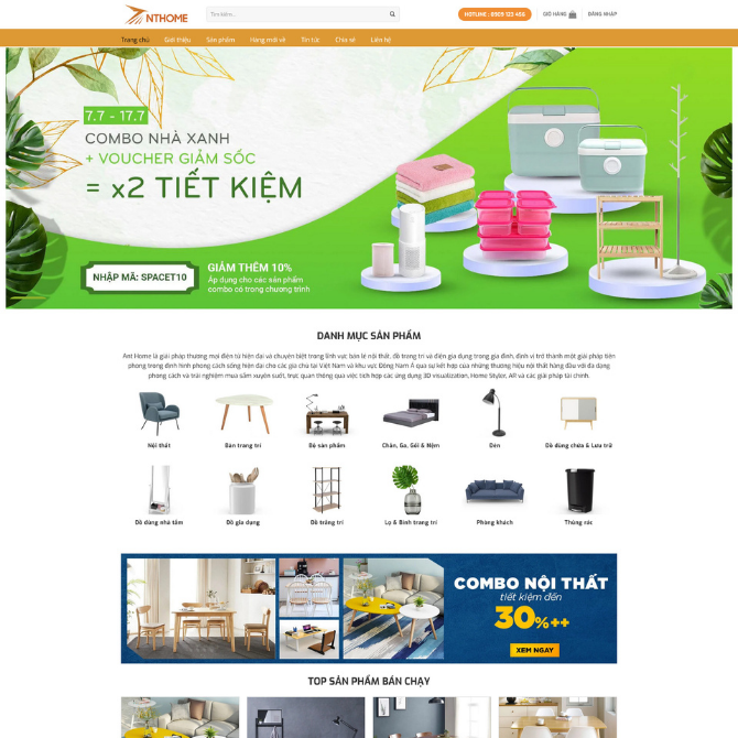 • Banner Khuyến Mãi Nổi Bật: Trình bày chương trình Combo Nhà Xanh, voucher giảm sốc và mã giảm giá, kết hợp hình ảnh sản phẩm nội thất – đồ dùng gia đình giúp thu hút khách hàng ngay khi truy cập.