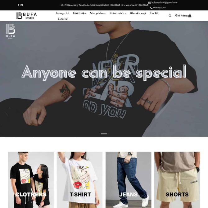 • Banner lớn Anyone can be special: Trình bày hình ảnh người mẫu mặc áo thun graphic kèm slogan nổi bật, tạo ấn tượng thương hiệu ngay khi truy cập.