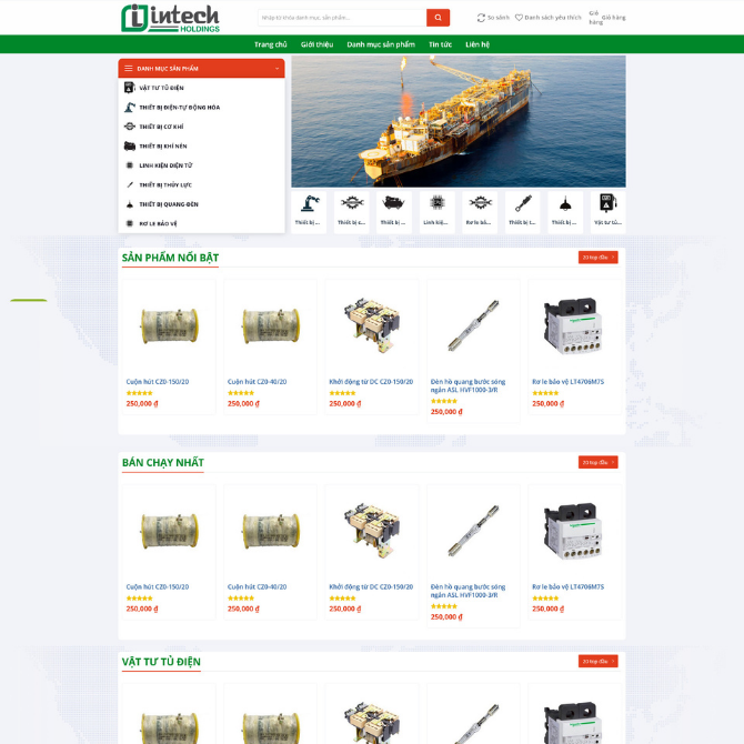 • Danh Mục Chuyên Sâu: Trình bày từng nhóm sản phẩm như Vật Tư Tủ Điện, Thiết Bị Điện Tự Động Hóa… với bố cục chia cột rõ ràng theo đúng bản demo.