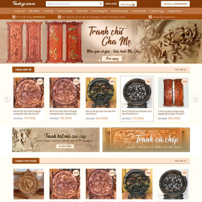 • Banner chủ đề nổi bật: Trình bày các dòng tranh chủ đạo như tranh chữ Cha Mẹ, tranh cá chép, tranh phong thủy với thông điệp rõ ràng.