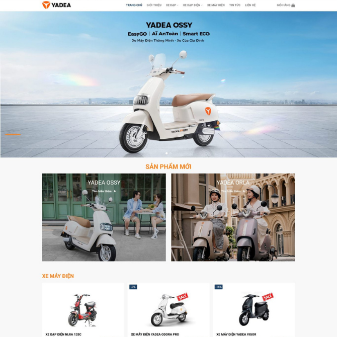 • Danh Mục Xe Đạp Điện: Bố cục đẹp mắt với nhiều mẫu xe như YADEA VIGOR, NINJA 133C… Hiển thị giá niêm yết và giá ưu đãi nếu có.