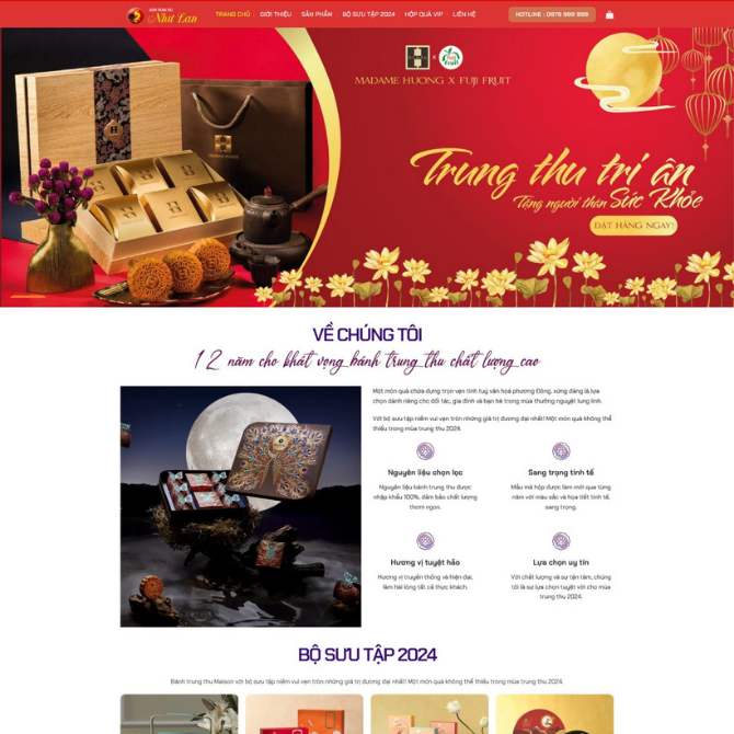 • Khu Vực Giới Thiệu Thương Hiệu: Trình bày thông điệp “12 năm cho khát vọng bánh trung thu chất lượng cao” cùng hình ảnh hộp bánh nghệ thuật. Tăng uy tín thương hiệu và tạo thiện cảm cho khách truy cập.