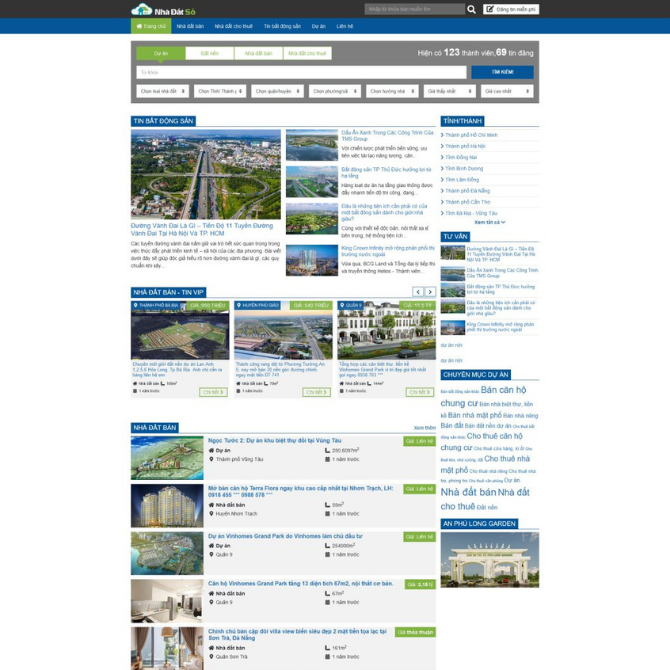 • Giao Diện Tin Tức – Rao Vặt Chuyên Nghiệp: Bố cục dạng cổng thông tin nhà đất, hiển thị nhiều danh mục rõ ràng như Nhà Đất Bán, Nhà Đất Cho Thuê, Tin Tức, Dự Án. Tông màu xanh – trắng hiện đại, phù hợp với lĩnh vực bất động sản và đơn vị môi giới chuyên nghiệp.