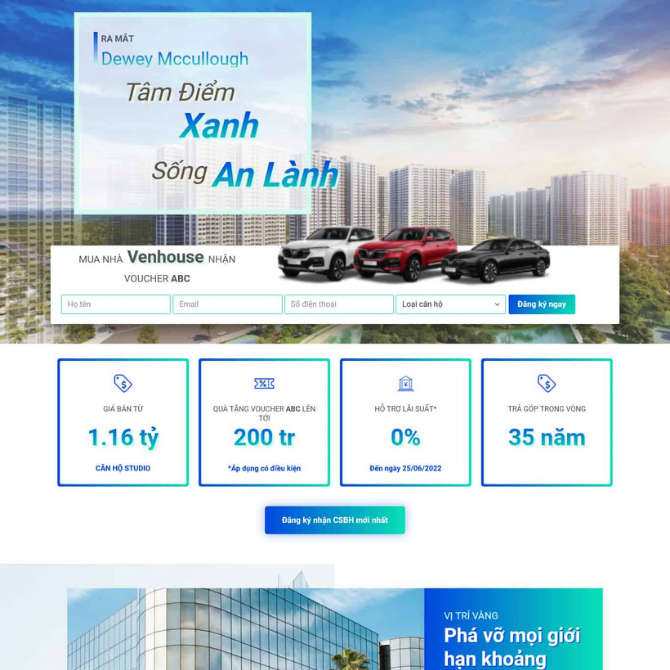 • Banner dự án kết hợp form đăng ký: Hình ảnh dự án nổi bật kèm form đăng ký giúp thu hút khách hàng ngay từ đầu trang.