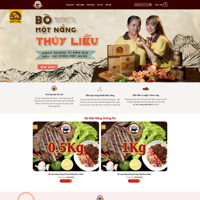 • Đặc Sản Chủ Đạo Bò Một Nắng Krông Pa: Hiển thị hai sản phẩm nổi bật 0.5kg và 1kg với hình ảnh sắc nét, trực quan, đúng bố cục demo.