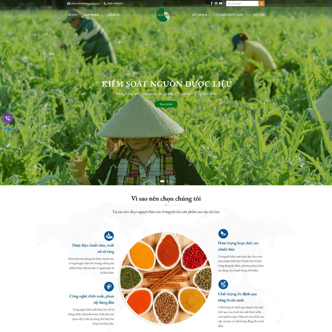 Website Công Ty Dược Liệu Dược Phẩm thuộc danh mục Website Công Ty. Giao diện được thiết kế theo phong cách tự nhiên – dược liệu, sử dụng tông màu xanh lá chủ đạo kết hợp hình ảnh vùng trồng thực tế. Bố cục tập trung giới thiệu nguồn nguyên liệu, sản phẩm và quy trình sản xuất giúp tăng độ tin cậy và thu hút khách hàng.