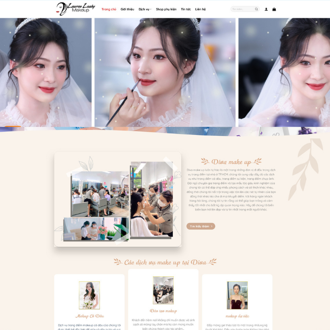• Tin Tức – Bài Viết: Khu blog gồm các bài viết về mẹo trang điểm, quy trình makeup cô dâu, xu hướng beauty, gợi ý dụng cụ makeup… mỗi bài kèm hình và mô tả ngắn.
