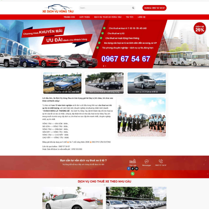 Website Dịch Vụ Cho Thuê Xe thuộc danh mục Website Dịch Vụ – Website Xe Cộ. Được xây dựng dành cho đơn vị kinh doanh cho thuê xe du lịch tại Vũng Tàu với định hướng giới thiệu dịch vụ rõ ràng và thúc đẩy liên hệ nhanh. Giao diện sử dụng banner lớn làm nổi bật chương trình khuyến mãi, số hotline và các loại hình cho thuê xe từ 4 chỗ, 7 chỗ, 16 chỗ đến xe tự lái, xe tour và xe hợp đồng. Giúp khách hàng dễ dàng nắm bắt dịch vụ ngay khi truy cập.
