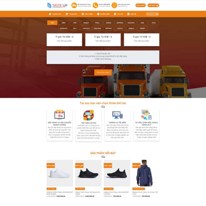 Website Dịch Vụ Order 247 thuộc danh mục Website Dịch Vụ. Giao diện được thiết kế theo định hướng dịch vụ đặt hàng và vận chuyển quốc tế, tập trung tối ưu quy trình tạo đơn và theo dõi đơn hàng trực tuyến. Bố cục trang chủ nổi bật với banner lớn tích hợp khu vực tra cứu và tạo đơn, các khối nội dung được sắp xếp rõ ràng từ lý do lựa chọn dịch vụ, sản phẩm nổi bật đến quy trình đặt hàng, giúp khách hàng dễ dàng thao tác và sử dụng dịch vụ.