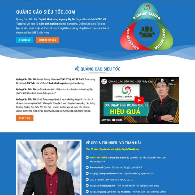 Website Dịch Vụ Quảng Cáo Siêu Tốc thuộc danh mục Website Dịch Vụ. Giao diện được thiết kế theo phong cách agency marketing – quảng cáo trực tuyến, bố cục hiện đại, tập trung giới thiệu dịch vụ, năng lực triển khai và xây dựng niềm tin với khách hàng. Nội dung được sắp xếp theo từng khối rõ ràng từ giới thiệu thương hiệu, dịch vụ quảng cáo, thế mạnh, đối tác đến bài viết chia sẻ kiến thức.