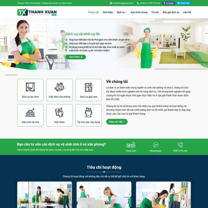 • Danh mục dịch vụ rõ ràng: Sắp xếp các dịch vụ vệ sinh theo từng nhóm như nhà ở, văn phòng và vệ sinh tổng thể.
