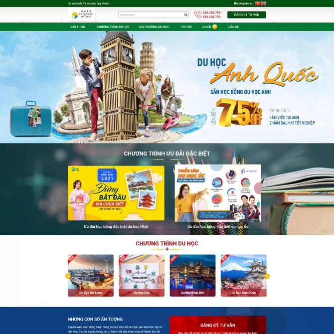 • Giao Diện Hiện Đại & Thu Hút: Banner lớn với hình ảnh du học sinh khám phá các quốc gia Anh – Nhật – Úc – Hàn, kết hợp tông màu xanh – vàng – đỏ tạo cảm giác năng động và chuyên nghiệp. Bố cục ấn tượng giúp trung tâm tư vấn du học ghi điểm ngay từ phút đầu tiên.