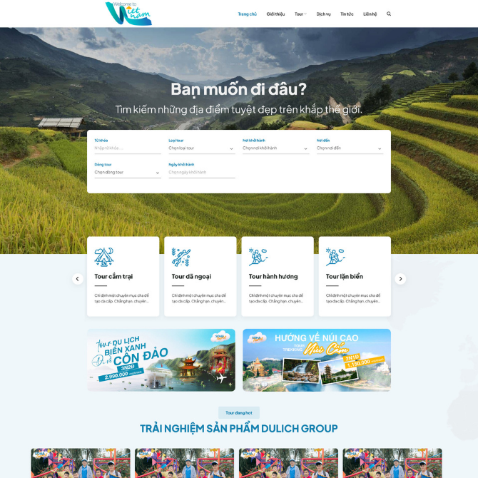 • Trải Nghiệm Sản Phẩm Du Lịch Group: Hiển thị các tour nổi bật với ảnh lớn, tên tour, thời gian, lịch khởi hành, mức giá và nút xem nhanh. Bố cục dạng slider hiện đại.