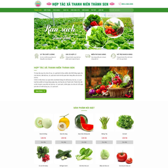 Website Hợp Tác Xã Nông Nghiệp thuộc danh mục Website Bán Hàng – Website Thực Phẩm. Giao diện được thiết kế theo phong cách hợp tác xã nông nghiệp – thực phẩm sạch, bố cục tập trung hiển thị banner hình ảnh rau sạch, khối giới thiệu hợp tác xã, sản phẩm nổi bật, tin tức cập nhật và cẩm nang sản phẩm. Tông màu xanh lá chủ đạo tạo cảm giác tự nhiên, các khối nội dung được sắp xếp mạch lạc từ trên xuống dưới, giúp khách hàng dễ theo dõi thông tin và duyệt sản phẩm.
