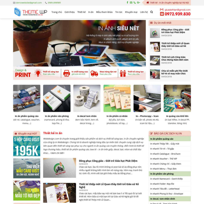 Website In Ấn 03 thuộc danh mục Website Dịch Vụ. Giao diện được thiết kế theo phong cách website in ấn – thiết kế đồ họa chuyên nghiệp, bố cục rõ ràng, hình ảnh thực tế sản phẩm in sắc nét, tập trung giới thiệu dịch vụ in, mẫu in ấn, khuyến mãi và báo giá. Nội dung được sắp xếp mạch lạc từ banner, danh mục dịch vụ đến bài viết và thông tin liên hệ, giúp khách hàng dễ dàng tìm hiểu và đặt dịch vụ.