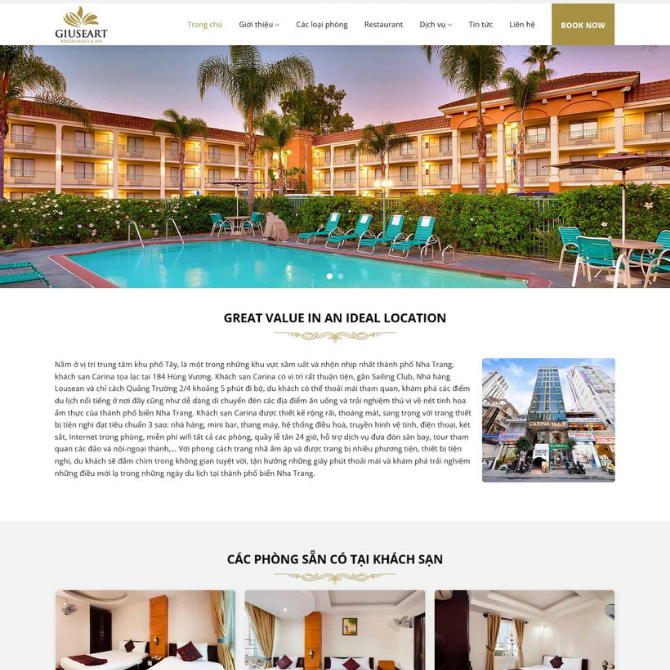 • Menu điều hướng rõ ràng: Có các mục như trang chủ, giới thiệu, các loại phòng, restaurant, dịch vụ, tin tức và liên hệ giúp truy cập mạch lạc.