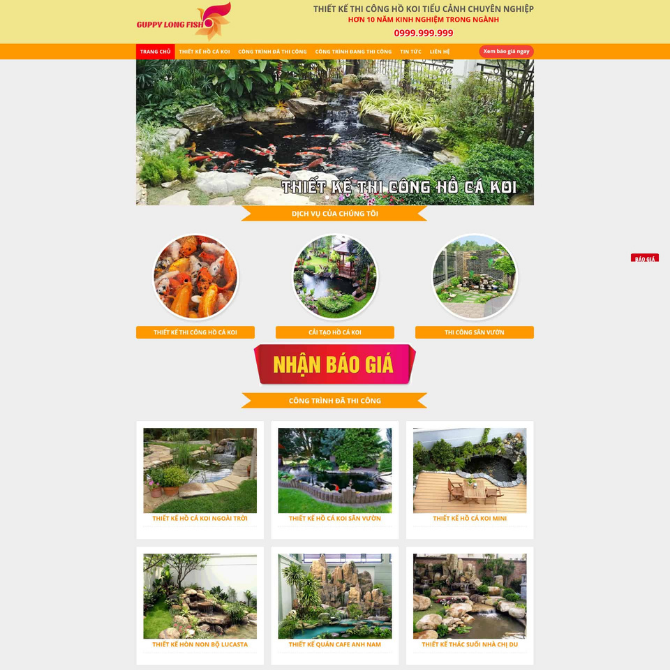 • Banner giới thiệu dịch vụ nổi bật: Phần đầu trang hiển thị hình ảnh hồ cá Koi thực tế kết hợp thông điệp “Thiết kế thi công hồ cá Koi”, tạo ấn tượng chuyên nghiệp và rõ ràng về lĩnh vực hoạt động.