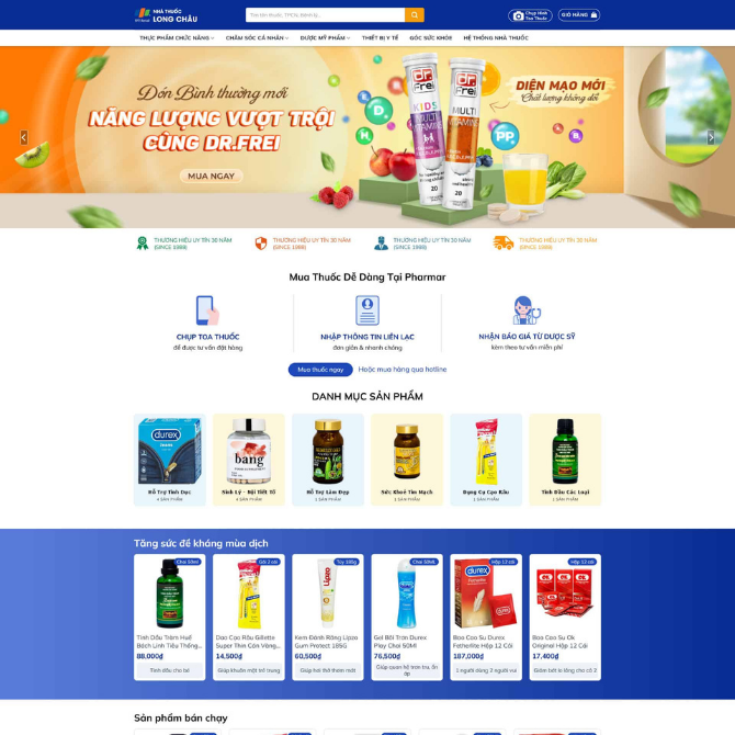 • Thông tin hệ thống nhà thuốc: Hiển thị liên kết xem hệ thống nhà thuốc toàn quốc và danh sách nhà thuốc. Phù hợp cho chuỗi dược phẩm xây dựng thương hiệu.