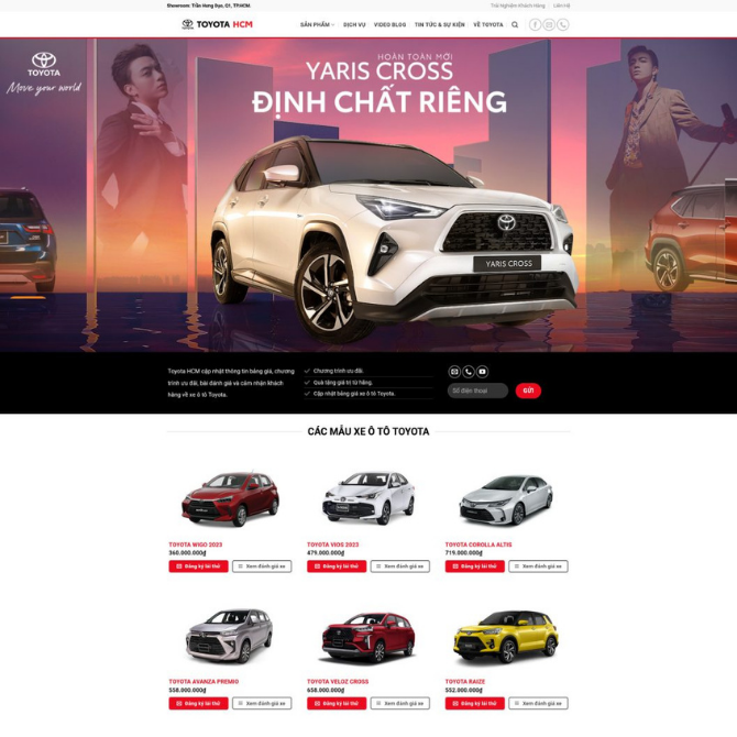 • Giao Diện Hiện Đại & Đẳng Cấp: Tông màu đen – trắng cùng sắc đỏ đặc trưng của Toyota tạo cảm giác mạnh mẽ, chuẩn phong cách ngành ô tô. Banner lớn Yaris Cross cực kỳ thu hút đúng như demo.