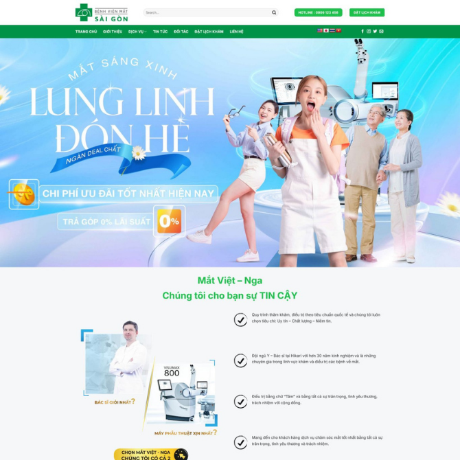 • Banner Chương Trình Ưu Đãi Ấn Tượng: Banner lớn “Lung linh đón hè – Mắt sáng xinh” kèm ưu đãi trả góp 0% giúp thu hút bệnh nhân ngay từ khi truy cập.