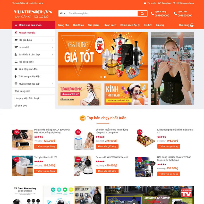 • Danh mục sản phẩm bên trái: Hiển thị nhóm sản phẩm đồ gia dụng, đồ mẹ bé, làm đẹp, đồ thể thao, đồ tiện ích.