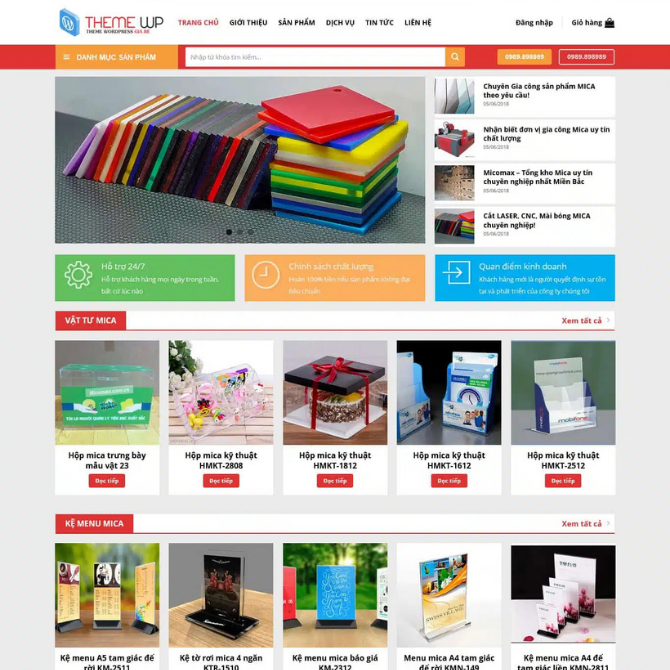 • Danh mục sản phẩm rõ ràng: Hiển thị các nhóm như Vật tư mica, Kệ menu mica, Kệ trưng bày sản phẩm, Quà tặng mica.