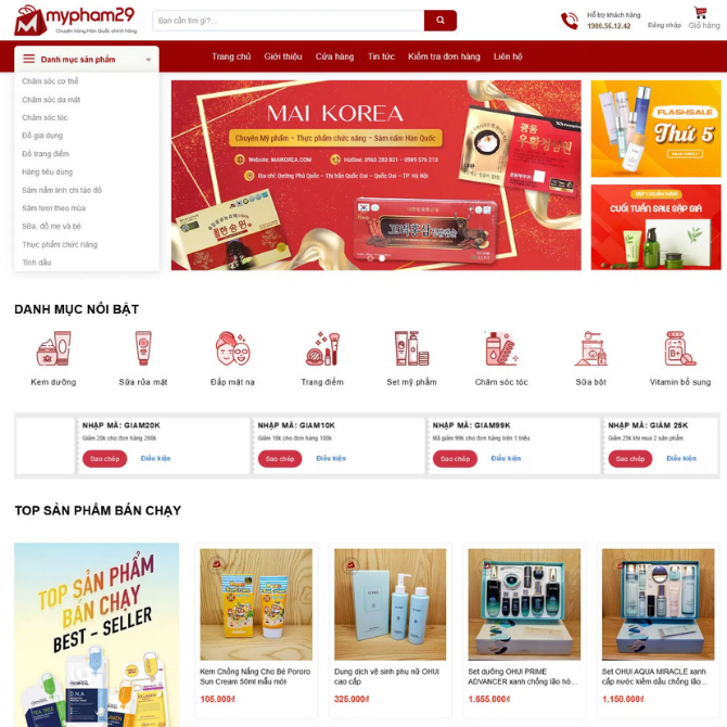 • Danh mục sản phẩm nổi bật: Hiển thị rõ các nhóm như chăm sóc da, sữa rửa mặt, đắp mặt nạ, trang điểm, chăm sóc tóc, vitamin bổ sung.