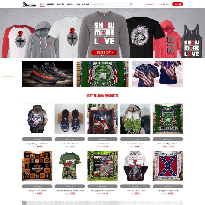 Website Shop Thời Trang Pod thuộc danh mục Website Bán Hàng – Website Thời Trang. Giao diện được thiết kế theo phong cách shop POD (Print On Demand), bố cục tập trung hiển thị banner sản phẩm nổi bật, các bộ sưu tập áo in hình, chăn in hình và khu vực sản phẩm bán chạy. Tông màu trắng – đen – đỏ chủ đạo tạo cảm giác hiện đại, các khối nội dung được sắp xếp theo dạng lưới từ trên xuống dưới, giúp khách hàng dễ duyệt sản phẩm và lựa chọn nhanh.