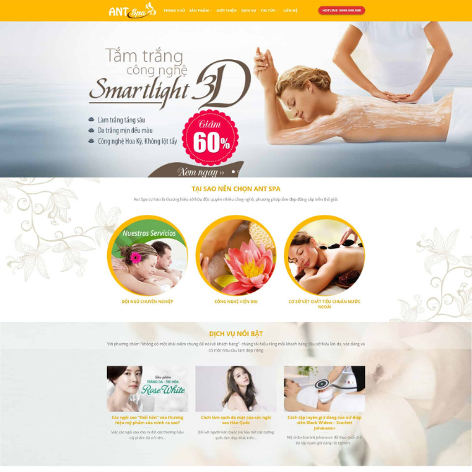 Website Spa 05 thuộc danh mục Website Spa. Giao diện được thiết kế theo phong cách tươi sáng, chuyên nghiệp, tập trung quảng bá dịch vụ làm trắng da và chăm sóc da công nghệ cao kết hợp bán sản phẩm spa. Trang chủ nổi bật với banner lớn giới thiệu liệu trình tắm trắng công nghệ Smartlight 3D cùng ưu đãi rõ ràng, thu hút khách hàng ngay từ lần truy cập đầu tiên. Bố cục nội dung được sắp xếp mạch lạc từ lý do lựa chọn spa, dịch vụ nổi bật, sản phẩm, tư vấn làm đẹp cho đến form đăng ký tư vấn, giúp tối ưu hiệu quả bán dịch vụ và chăm sóc khách hàng. Website Spa 05 phù hợp cho spa và thẩm mỹ viện muốn xây dựng kênh giới thiệu dịch vụ – sản phẩm chuyên nghiệp để phục vụ mục tiêu kinh doanh.