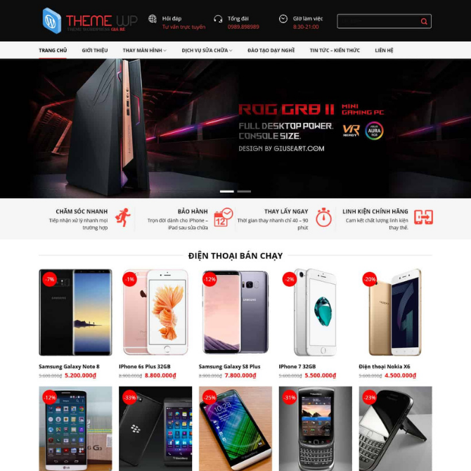 Website Sửa Điện Thoại thuộc danh mục Website Dịch Vụ – Website Điện Thoại. Được thiết kế theo phong cách hiện đại, tập trung vào bố cục giới thiệu dịch vụ sửa chữa và xây dựng độ tin cậy với khách hàng. Giao diện sử dụng banner lớn ở đầu trang, các khu vực trưng bày dịch vụ, sản phẩm bán chạy, giới thiệu đào tạo nghề, tin tức và thông tin liên hệ được sắp xếp khoa học. Cách trình bày rõ ràng giúp người dùng dễ dàng thay đổi nội dung khi sử dụng và tối ưu hiệu quả tư vấn – tiếp nhận khách hàng trực tuyến.