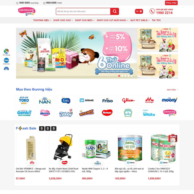 • Danh mục nổi bật: Hiển thị sữa bột cho bé, sữa công thức, tã bỉm, nước giặt, đồ ăn dặm, xe đẩy, ghế ăn, combo bé.