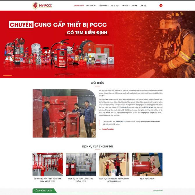 • Banner Thông Điệp Mạnh Mẽ: Banner lớn “Chuyên cung cấp thiết bị PCCC có tem kiểm định”. Giúp thu hút người xem và thể hiện rõ lĩnh vực kinh doanh ngay từ đầu trang.