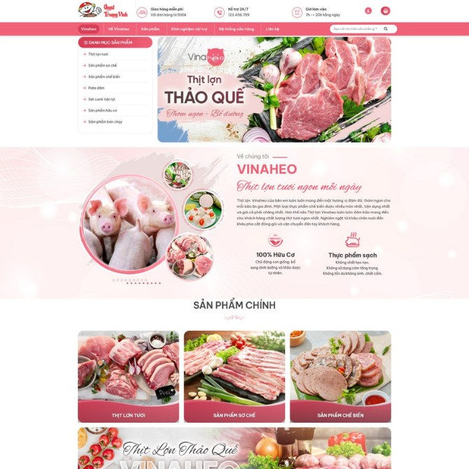 • Giao Diện Tươi Sáng & Hấp Dẫn: Tông màu hồng – trắng nhẹ nhàng, hình ảnh thịt heo và xúc xích sắc nét. Tạo cảm giác tươi ngon, sạch sẽ và đúng chuẩn thương hiệu thực phẩm.