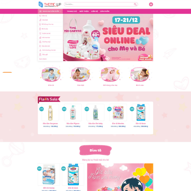 Website Thời Trang Bỉm Tã Sữa 02 (Website Thời Trang, Website Bán Hàng) có tone hồng dễ thương, bố cục rõ ràng và tập trung mạnh vào ưu đãi cho ngành mẹ và bé. Giao diện giúp khách xem sản phẩm nhanh, nhận biết giảm giá trực quan và đi đến nhóm hàng cần mua chỉ với vài thao tác. Đây là mẫu phù hợp cho nhà cung cấp và người mua giao diện triển khai website phục vụ mục đích kinh doanh, tối ưu trưng bày và tăng chuyển đổi.