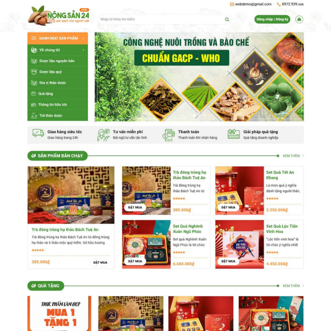Website Thực Phẩm 25 Bán Quà Tặng thuộc danh mục Website Bán Hàng – Website Thực Phẩm. Được thiết kế chuyên biệt cho cửa hàng, doanh nghiệp và đơn vị kinh doanh thực phẩm cao cấp, quà biếu sức khỏe với bố cục tập trung trưng bày sản phẩm bán chạy, quà tặng, dược liệu quý và thông tin hữu ích. Giao diện sử dụng màu xanh chủ đạo kết hợp hình ảnh sản phẩm rõ nét, bố cục chia khối theo từng nhóm giúp khách hàng dễ xem, dễ chọn và dễ đặt mua. Nội dung được trình bày liền mạch từ banner công nghệ nuôi trồng, danh mục bên trái, sản phẩm bán chạy, quà tặng, dược liệu quý, trà thảo dược, gia vị thảo dược, thông tin hữu ích, hoạt động và đối tác, tối ưu cho bán lẻ và bán quà tặng doanh nghiệp.