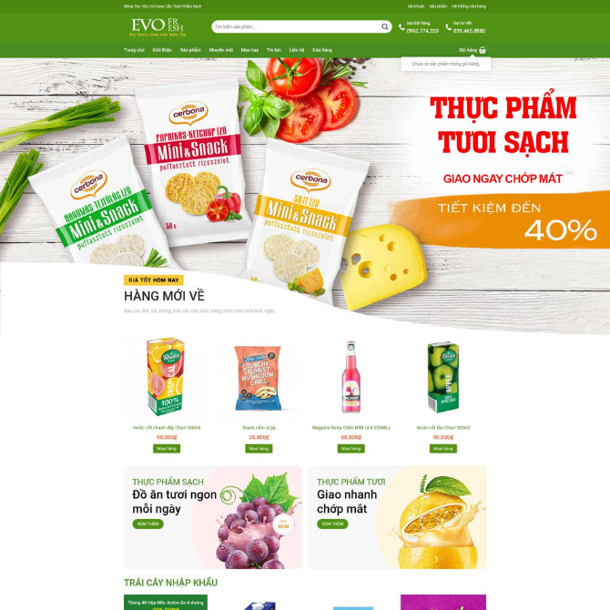 • Khối thực phẩm sạch – giao nhanh chớp mắt: Trình bày hình ảnh nho, chanh, trái cây tươi theo dạng banner ngang.