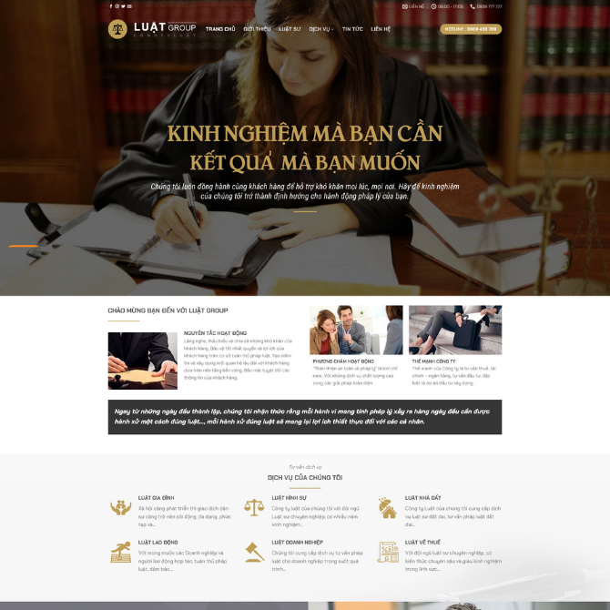 • Banner Thương Hiệu Ấn Tượng: Trình bày thông điệp “Kinh nghiệm mà bạn cần – Kết quả mà bạn muốn” cùng hình ảnh luật sư đang làm việc. Tạo cảm giác chuyên nghiệp và đáng tin cậy ngay khi truy cập.